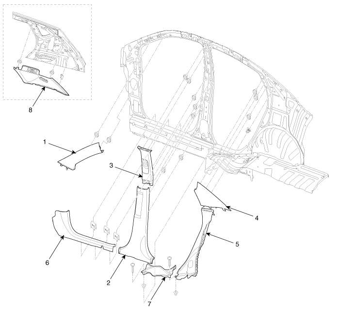 | 1. Front pillar trim 2. Center pillar lower trim 3. Center pillar upper trim 4. Rear pillar trim [4 Door] | 5. Rear wheelhousing trim 6. Front door scuff trim 7. Rear door scuff trim 8. Rear pillar trim [5 Door] |